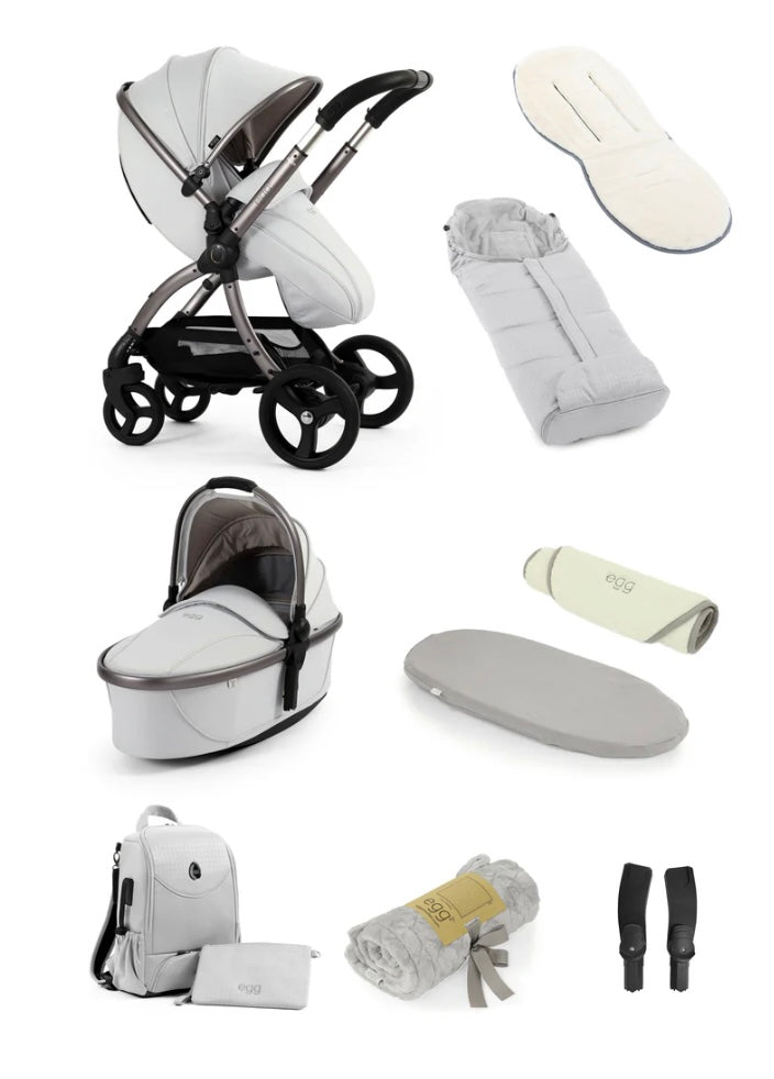 Stroller includes: Rain cover, insect net, apron and reversible fleece liner. Suitable from 6 months to 25kg (from birth with the egg3® carrycot).