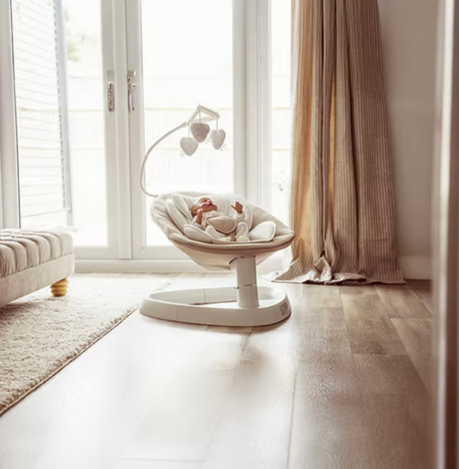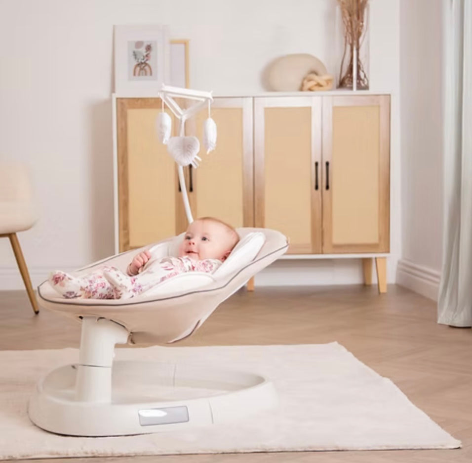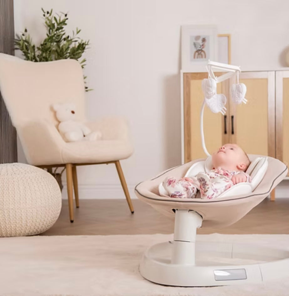 We all know that babies are happiest when held or rocked and the Sway Swing will help make your baby incredibly happy and content. Featuring calming side to side swaying action to replicate a soft rocking motion along the sounds of soothing music and lullabies. Fully supported in a deep padded soft seat with added head protection. Modern toy bar with cute soft hanging toys for baby’s attention. Lightweight and easy to move around, you will not want to be without the Sway Swing.